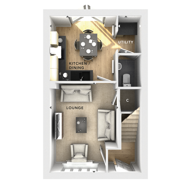The ground floor offers an open plan kitchen and dining area complimented by a contemporary set of French doors, perfect to keep open on a sunny weekend, or even on the weekdays if you're working from home! The kitchen also benefits from an integrated oven and a handy utility area. The spacious lounge is a warm welcoming space where you can relax and unwind in the evenings and also offers a cleverly hidden storage cupboard underneath the stairs.