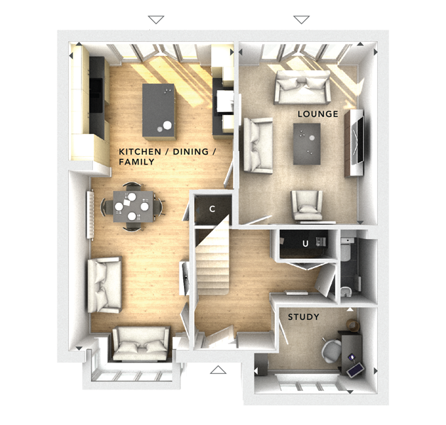 It's no wonder the Harwood is a popular style of Bloor home, with the beautifully open and spacious kitchen / dining / family room that extends across the width of the ground floor - over 26ft long. The kitchen space features not only a lovely set of French doors, but sleek Symphony kitchen units and worktops alongside the integrated double oven. The island style kitchen offers an additional worktop space for you, keeping the kitchen wonderfully social. Finally the family area is complete with a traditional style bay window.